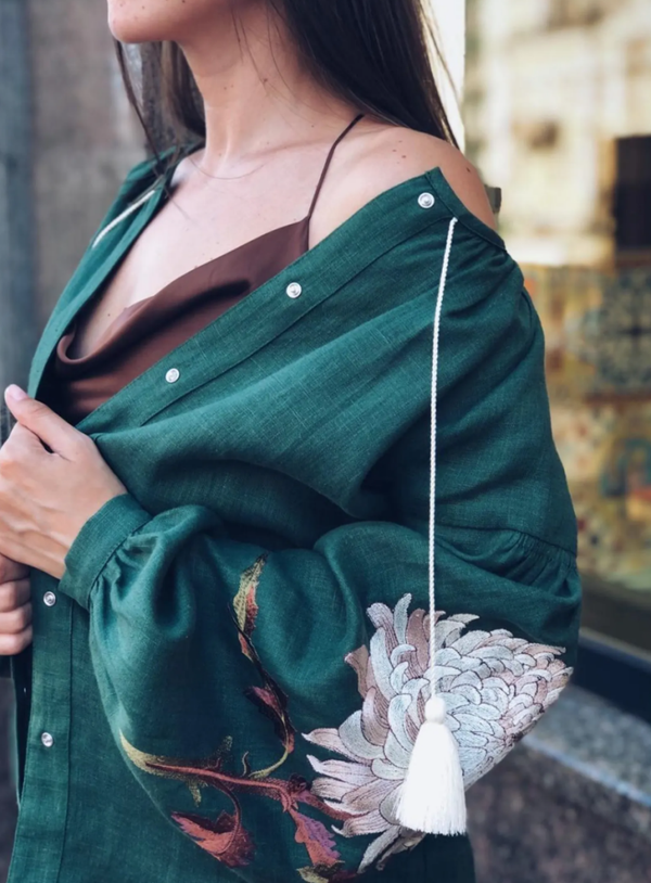 Die so feminine Blume, die Dahlie (früher Georgine genannt) lebt uns vor, wie behutsam man mit einer Frau umgehen sollte: Man lässt ihre Zwiebeln nicht einfach in der kalten Erde überwintern, sondern gräbt sie jeden Herbst mühevoll aus, lagert sie trocken gebettet im inneren des Hauses, um sie im Frühling wieder in den Garten einzupflanzen. Die Damen der Schöpfung haben es ebenso verdient, vor Härte und Kälte, den Frösten des Winters beschützt zu werden, auch wenn es viel Mühe kostet! Deshalb zelebrieren wir uns selbst mit dieser handgemachten, maßgeschneiderten Leinenbluse, die mit liebevoll gearbeiteten Dahlien bestickt ist!