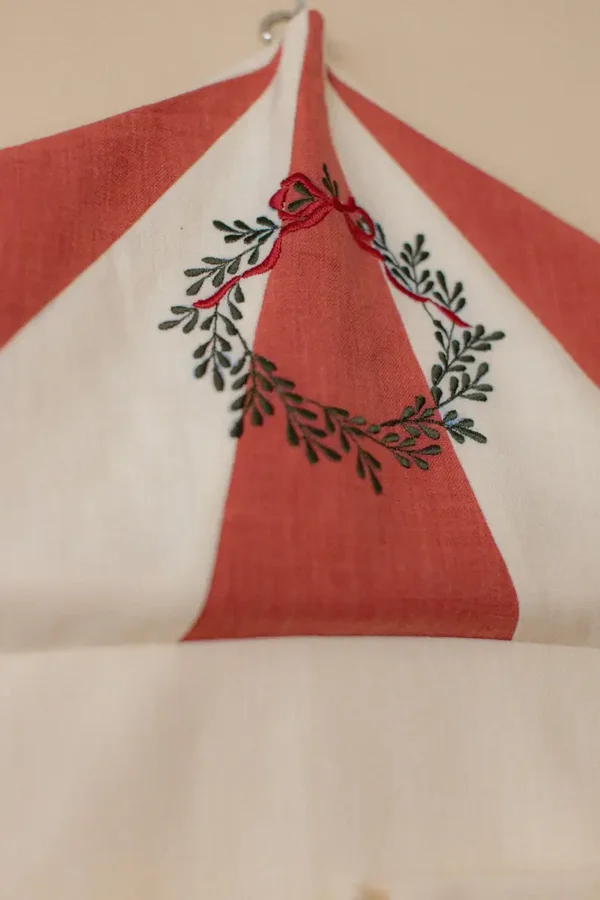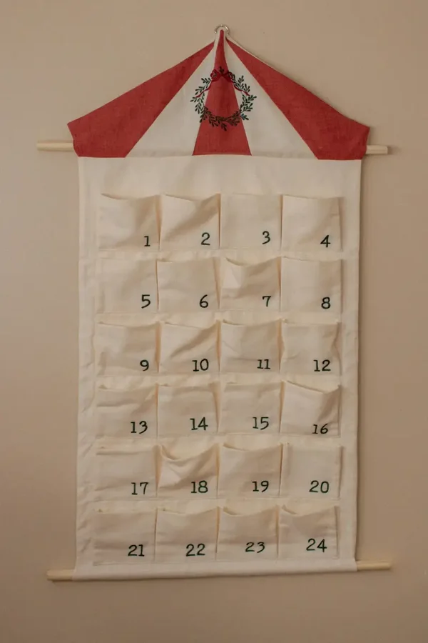 Der Adventskalender aus Leinen, mit Julkranz und Zahlen von Hand bestickt.