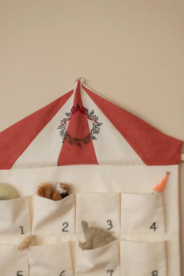 Jeder der 24 Dezembertage hat seine eigene kleine Tasche, die jedes Jahr mit Botschaften, Unternehmungen, kleinen Geschenken, Pralinen, Süßigkeiten, Schmuckstücken ... befüllt werden kann: Ganz wie es der persönlichen Familientradition entspricht. Jede Tasche ist mit der jeweiligen Zahl in dunkelgrün bestickt.