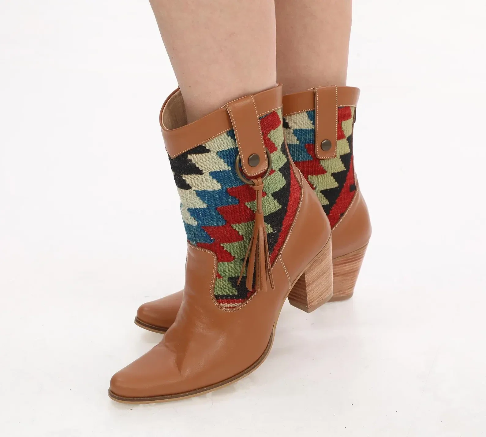 Die Stiefelette, die dem naturnahen Kleid eine ganz besondere Aussage verleiht: Folklore in Naturtönen mit eingearbeitetem Vintage Kelim, dazu aus Echtleder innen und außen und auf Maß geschustert! Ein Alltagsstiefel, der auch als "schick" für den Abend interpretiert werden kann. Er passt zu all unseren naturverschmolzenen, weit schwingenden und Leinenkleidern, zu allen Stücken, die farblich kombinierbar sind und ganz besonders zu unseren Wollsachen!