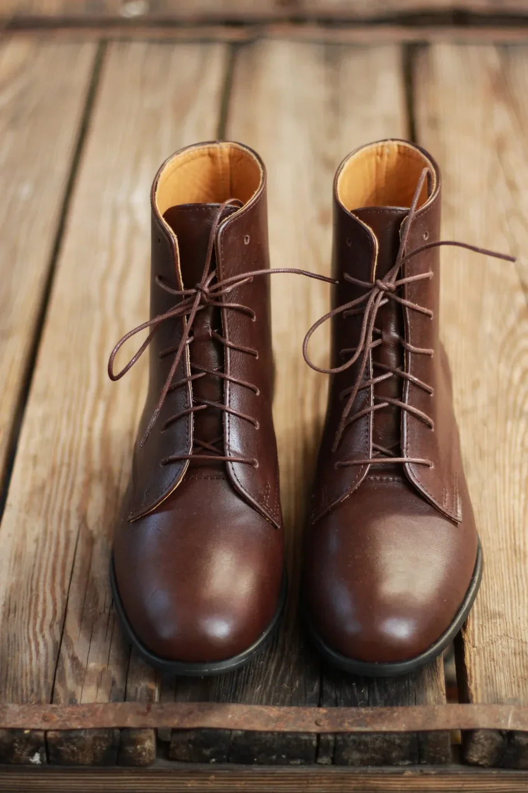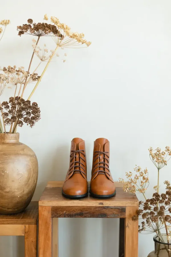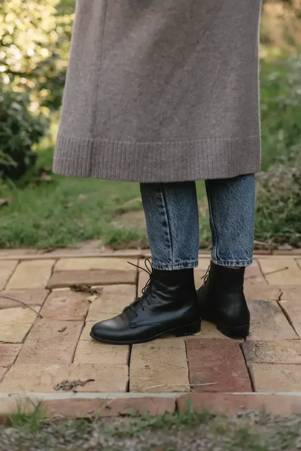 Jedes Detail wurde sorgfältig ausgewählt: die leicht abgewinkelten, stabilen und dezenten Absätze vermitteln Leichtigkeit und ein nostalgisches Gefühl. Sie hat gewachste Baumwollschnürsenkel, eine bequeme ovale Vorderseite und eine Schafthöhe, die knapp über den Knöchel reicht.